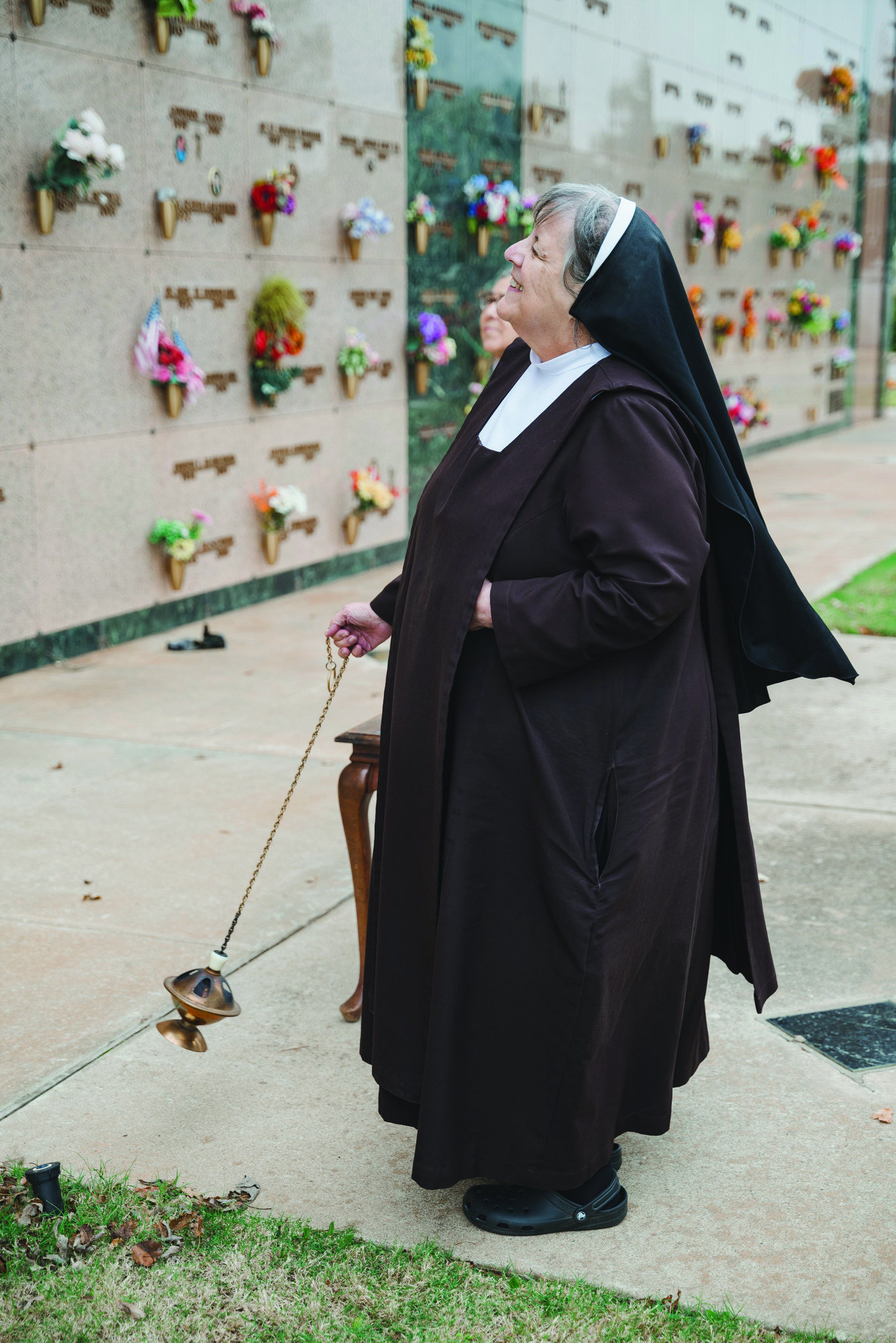 Sr. Barbara Joseph held a thurible at Resurrection Memorial Cemetery in Oklahoma City after a Mass for unclaimed homeless individuals in 2022. Photo Avery Holt/Archdiocese of Oklahoma City.