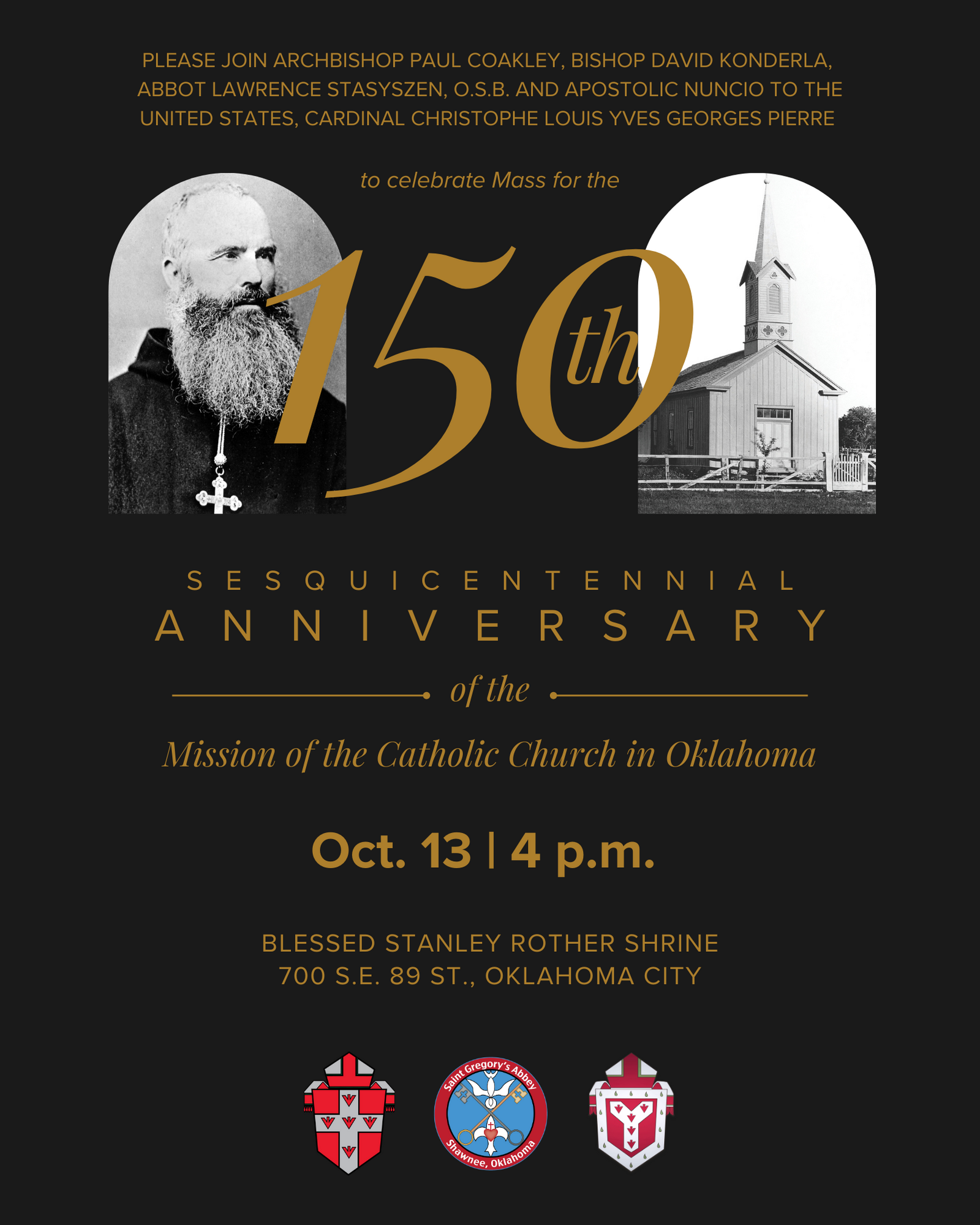 The sesquicentennial of the mission of the Catholic Church in Oklahoma will feature a Solemn Mass at 4 p.m. Oct. 13 at the Blessed Stanley Rother Shrine in Oklahoma City. His Eminence, Christophe Cardinal Pierre, Papal Nuncio to the United States, will preside, with Most Reverend Paul Coakley, archbishop of Oklahoma City, Most Reverend David Konderla, Bishop of Tulsa, leaders of American Indian nations and clergy from across the state joining the monks of Saint Gregory’s Abbey and representatives of other monasteries actively participating in the liturgy.