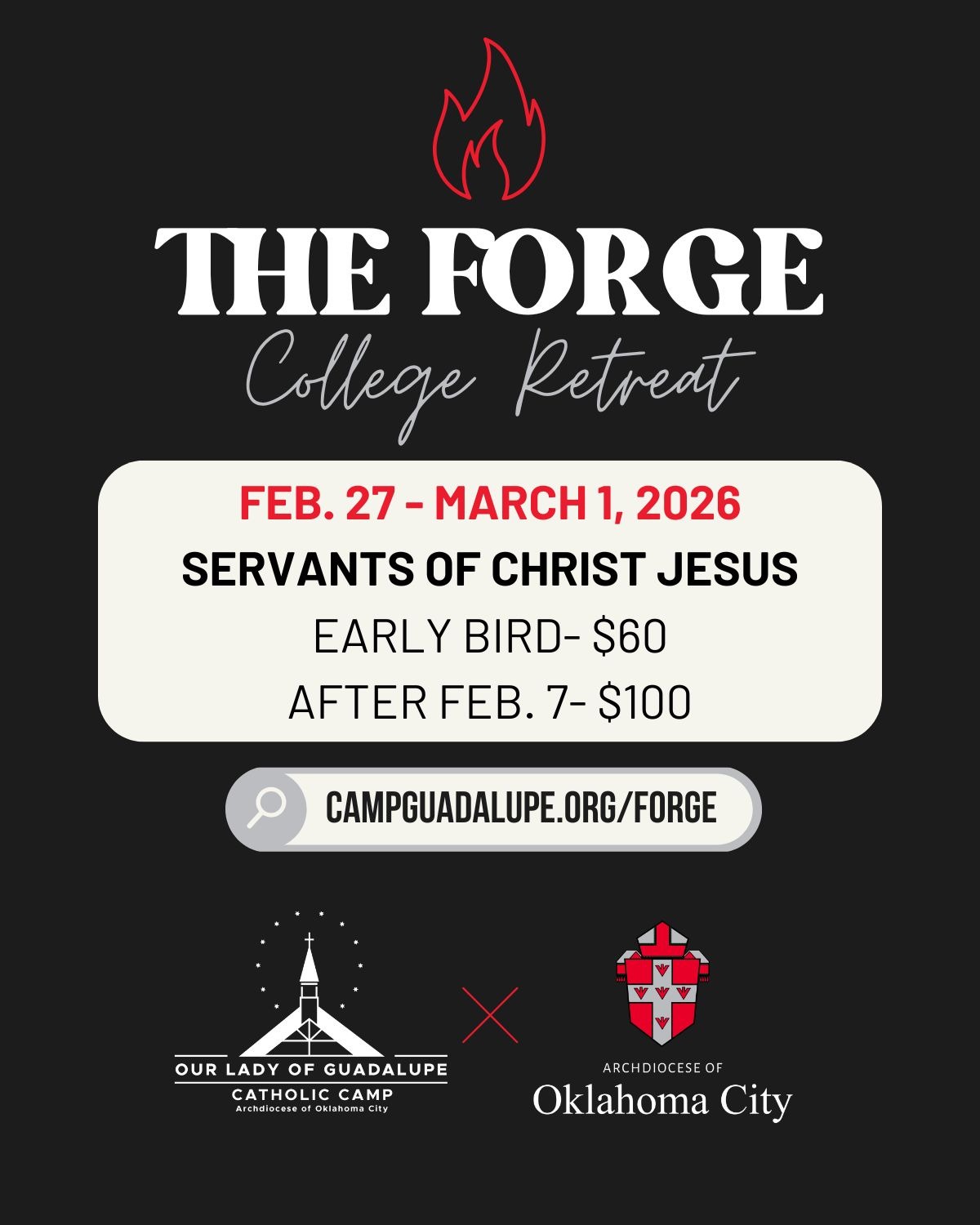 The forge college retreat with the Servants of Christ Jesus is Feb. 27-March 1 at Our Lady of Guadalupe Catholic Camp in Wellston. Early bird price $60. After Feb. 7 $100. Visit